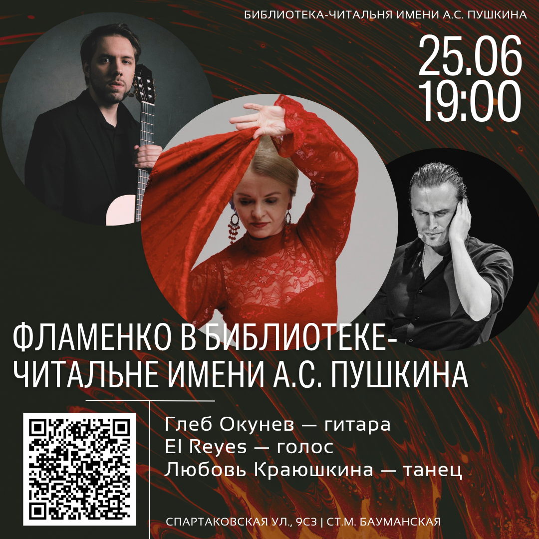 Концерт пройдет в стиле испанского традиционного таблао. Яркие костюмы, стук каблуков, взмах юбки и веера, звуки кастаньет все это запечатлено в танце московской танцовщицы фламенко Любови Краюшкиной. Танцевальное шоу будет проходить под аккомпанемент лучших московских профессиональных музыкантов фламенко. Гитара Глеб Окунев, голос Alejandro El Reyes. Жаркие ритмы Испании не оставят никого равнодушными! Ждем!